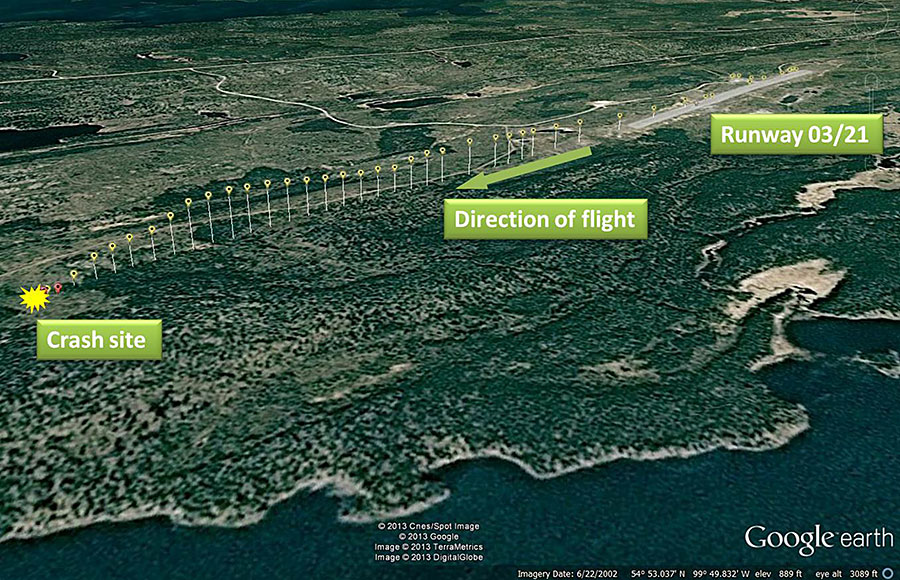 De l'information a été récupérée des systèmes d'instruments de vol électroniques embarqués Chelton et convertie en points de données temps-emplacement. Les points de données ont été organisés et comparés aux vents en altitude prévus afin de déterminer la vitesse-sol, et la trajectoire de vol obtenue a été affichée au moyen de Google Earth (annexe H).