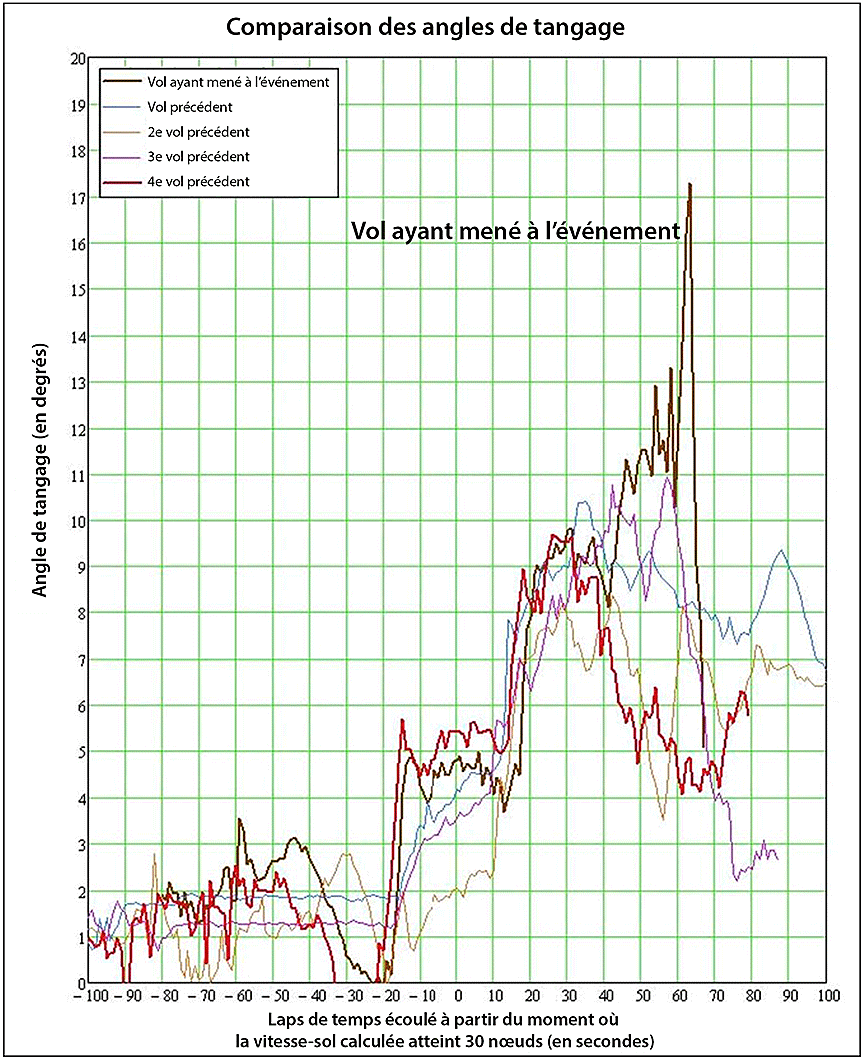Les données enregistrées indiquaient qu'après le décollage, l'aéronef a commencé à monter à une vitesse corrigée se situant entre 85 et 90 nœuds, et il a atteint une vitesse maximale de 90 nœuds. L'angle de tangage est demeuré à environ 9° tandis que l'angle de trajectoire de vol se situait entre 2° et 4°. Entre 9 h 55 min 28 s et 9 h 55 min 32 s, l'angle de tangage a diminué à environ 8°. À 9 h 55 min 32 s, l'angle de tangage a commencé à augmenter de nouveau, la vitesse corrigée demeurant à une valeur entre 85 et 90 nœuds. À partir de 9 h 55 min 39 s, la vitesse corrigée calculée et l'angle de la trajectoire de vol ont commencé à diminuer; l'angle de tangage était d'environ 11°. La diminution de l'angle de trajectoire de vol indiquait que l'angle d'attaque augmentait, cet angle se situant à environ 10°. De 9 h 55 min 44 s à 9 h 55 min 50 s, l'angle de tangage a commencé à fluctuer entre 11° et 13°. À 9 h 55 min 50 s, l'angle de tangage a commencé à augmenter alors que l'angle de trajectoire de vol commençait à diminuer, ce qui signifiait que l'angle d'attaque augmentaitNote de bas de page 11. À 9 h 55 min 54 s, l'angle de tangage a atteint un maximum de 17° et l'angle de trajectoire de vol se situait entre 1° et 2°. Après 9 h 55 min 54 s, l'angle de tangage et l'angle de trajectoire de vol ont chuté rapidement, ce qui indiquait une augmentation de l'angle d'attaque, qui passait alors de 10° à 30°. Le comportement des données porte à croire que l'aéronef se trouvait en situation de décrochage 5 secondes avant la fin des données. Un schéma de la trajectoire de vol calculée figure à l'annexe H.