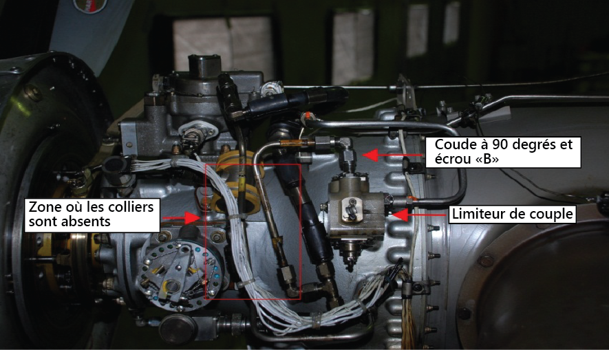 Une inspection du moteur après l'accident a révélé que l'écrou B du coude de 90° relié au raccord union mâle de la sortie d'huile située au-dessus du limiteur de couple était détaché. Normalement, le moteur contient 13,6 litres d'huile; il restait moins d'un litre d'huile dans le moteur. En outre, il manquait deux ensembles de colliers sur la tuyauterie de l'ensemble (photo 1). Le capteur magnétique du détecteur de limailles a été retiré; il était entièrement recouvert de particules ferreuses. Après le retrait du filtre à huile, on a constaté qu'il était recouvert de particules ferreuses et non ferreuses.