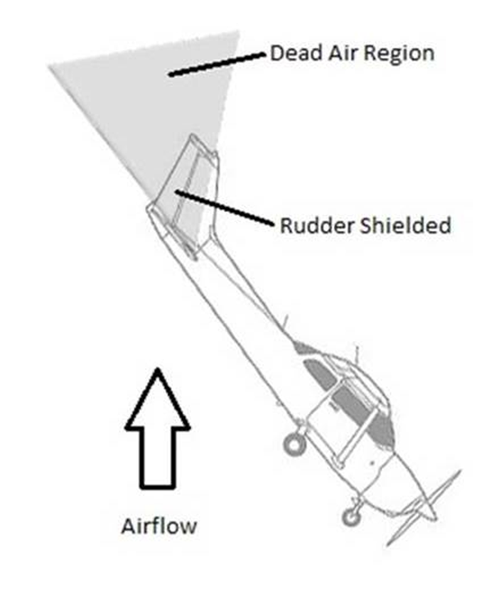 [Traduction]) [D]urant une vrille, une bonne partie du gouvernail de direction se trouve habituellement dans le sillage décroché de l'empennage horizontal et parfois de l'aile, au-dessus de laquelle la pression dynamique est faible ou encore l'écoulement d'air est anormal. […] Cette figure [figure 1] illustre la zone de sillage décroché autour de la majeure partie de l'empennage vertical, causée par l'empennage horizontal, et qui réduit considérablement l'efficacité du gouvernail de directionNote de bas de page 7.