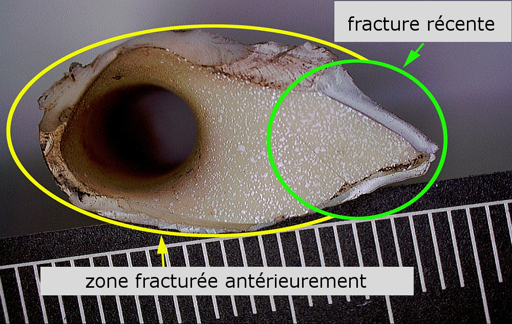Durant l'examen subséquent effectué à son installation régionale, le Bureau de la sécurité des transports (BST) a déterminé que la prise d'air de l'avertisseur de décrochage était fissurée. On a envoyé l'avertisseur de décrochage au Laboratoire d'ingénierie du BST aux fins d'examen. L'examen au microscope de la cassure a révélé qu'une zone s'était fracturée par le passé, comme l'indiquait la décoloration des surfaces fracturées. Une autre zone de la cassure montrait une fracture plus récente (photo 2), que l'on a attribué aux forces de l'impact. Selon les procédures d'entretien du fabricant, l'inspection de l'avertisseur de décrochage, y compris son fonctionnement, a lieu lors de chaque vérification « A »
