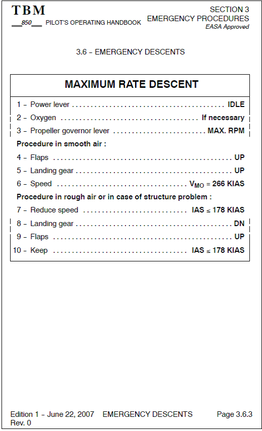 Annexe A – Procédure de descente d'urgence pour le TBM 850