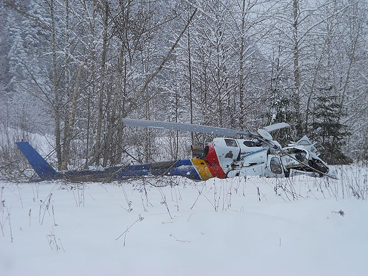 En raison de la force de l'impact avec le sol, le patin d'atterrissage droit s'est brisé; la cabine, le plateau du moteur et de la boîte de transmission ainsi que la structure de la cellule principale se sont affaissés (photo 3). Au contact avec le sol, le réservoir interne de carburant a aussi été détruit par le dispositif d'élingue et crochet de charge installé. La poutre-fuselage et les pales du rotor de queue ont heurté le sol, faisant flamber la structure au complet. Deux des pales du rotor principal étaient intactes et présentaient peu de dommages, tandis que l'impact avec le sol a causé d'importants dommages à la troisième pale. Les 2 pales du rotor de queue ont été endommagées. Une pale ne présentait aucun dommage, hormis la présence de bois dans sa languette de butée. L'autre pale était presque complètement fracturée près de son pied ou moyeu. Les dommages aux pales du rotor principal et du rotor de queue étaient caractéristiques d'un régime extrêmement faible au moment de l'impact. Cependant, il n'y a eu aucun signe de défaillance mécanique des systèmes de commande de vol ou d'entraînement du rotor de l'hélicoptère avant l'accident qui aurait pu contribuer à une perte de maîtrise de l'hélicoptère.