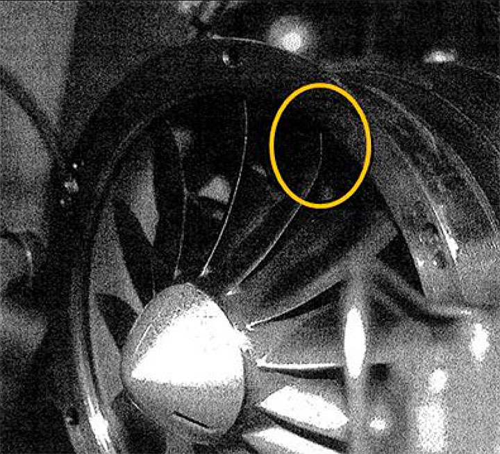 Toutes les aubes du compresseur étaient pliées vers l'avant du plan de rotation vertical normalement parcouru par les extrémités des aubes, mais seulement 1 aube l'était considérablement et de manière très apparente.