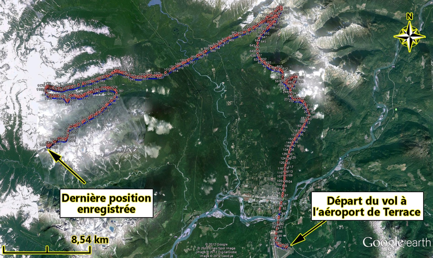 L'itinéraire de vol de BHL a été déposé auprès de son bureau de régulation des vols à Fort Saint John (Colombie-Britannique); il précisait que le technicien d'entretien d'aéronef (TEA) de l'entreprise serait passager. L'appareil a décollé de l'aéroport de Terrace à 7 h 54Note de bas de page 2. L'hélicoptère est demeuré à moins de 15 milles marins (nm) de Terrace et volait en direction nord le long du côté est de la vallée de la rivière Kitsumkalum. Les données de position extraites de 3 systèmes mondiaux de localisation (GPS) différents ont révélé que certaines manœuvres ont eu lieu à 2 endroits avant que l'hélicoptère se dirige vers l'ouest pour traverser la rivière Kitsumkalum (figure 1). Sur le côté ouest de la vallée, l'hélicoptère est entré dans un ravin en direction sud-ouest et a volé le long du côté droit, ou sud, du ravin. Près du point le plus élevé du ravin, soit environ 3800 pieds au-dessus du niveau de la mer (asl), l'hélicoptère a effectué un virage à 180° à gauche et a rebroussé chemin, en descendant, le long du versant nord du ravin. L'hélicoptère a ensuite amorcé un virage à droite, a traversé une crête et a descendu dans un autre ravin parallèle au premier. L'hélicoptère a tourné de nouveau vers le sud-ouest pour remonter le ravin et a commencé à grimper, en réduisant sa vitesse sol, en suivant le contour du relief sur le côté gauche du ravin.