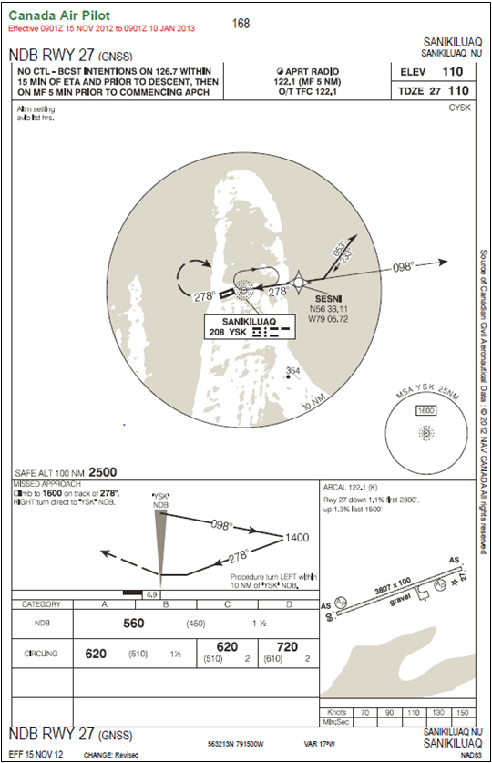 Le commandant a décidé de ne pas retourner à CYWG pour récupérer les cartes, car cela aurait retardé encore plus le vol et prolongé le temps de service de l’équipage. Il a plutôt communiqué par radio avec un autre pilote de l’entreprise qui lui a fourni les renseignements de la carte pour l’approche aux instruments par radiophare non directionnel (NDB) de la piste 27 à CYSK (annexe A). Les renseignements qu’il a obtenus ne comprenaient ni la direction pour le virage conventionnel ni l’altitude minimale de descente (MDA) (620 pieds au-dessus du niveau de la mer [asl]) pour l’approche indirecte de la piste 09.