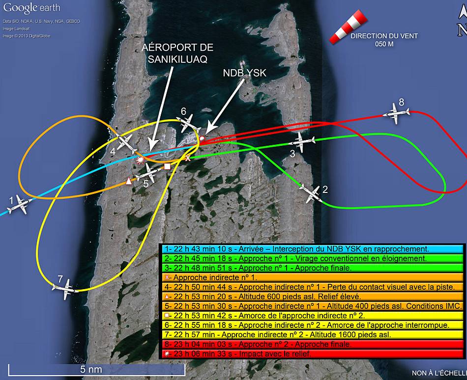 Sinon, il exécuterait plutôt une approche aux instruments NDB de la piste 27 avec une approche indirecte de la piste 09. L’équipage a fait un exposé pour cette approche, puis a réglé les instruments, les aides à la navigation, le GPS (système mondial de positionnement pour navigation satellite) et les radios nécessaires pour l’approche NDB. L’équipage a fait un exposé d’approche interrompue, soit le cap de piste à la MSA. L’heure d’arrivée prévue à CYSK était 22 h 43 UTC. L’équipage avait l’intention d’exécuter 2 approches avant le déroutement vers l’aéroport de dégagement. L’équipage n’est pas tenu, ni par la réglementation ni par les procédures de l’entreprise, de faire un exposé sur la sécurité aux passagers avant la descente ou l’atterrissage. Néanmoins, avant le décollage, les passagers avaient été informés durant l’exposé sur la sécurité de garder leurs ceintures de sécurité bouclées durant tout le vol.