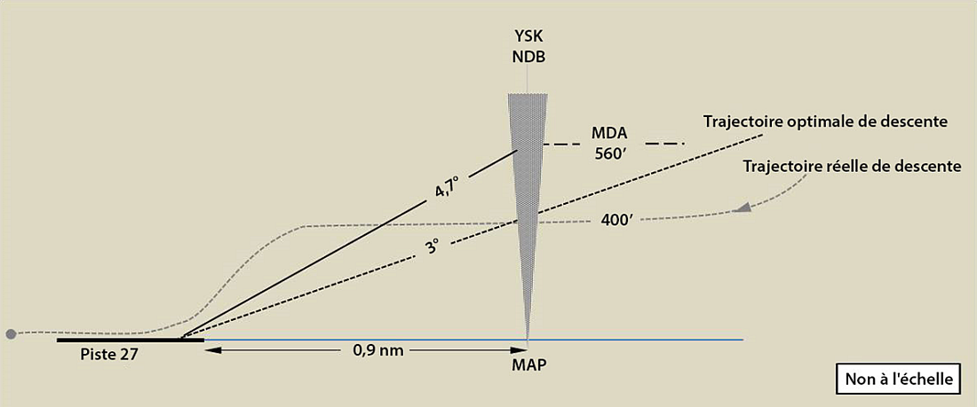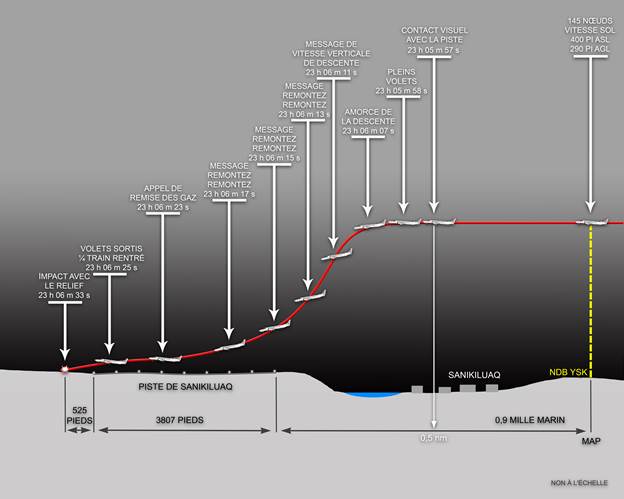 À 23 h 5 min 57 s UTC, l’équipage a établi le contact visuel avec la piste à une altitude indiquée de 400 pieds, tout juste après le point d’approche interrompue (MAP), à environ 0,7 nm du seuil de la piste 27. L’équipage a sélectionné pleins volets pour l’atterrissage, a réduit la puissance au ralenti, et a amorcé la descente à 23 h 6 min 7 s UTC. La vitesse était alors de 140 nœuds (annexe D).