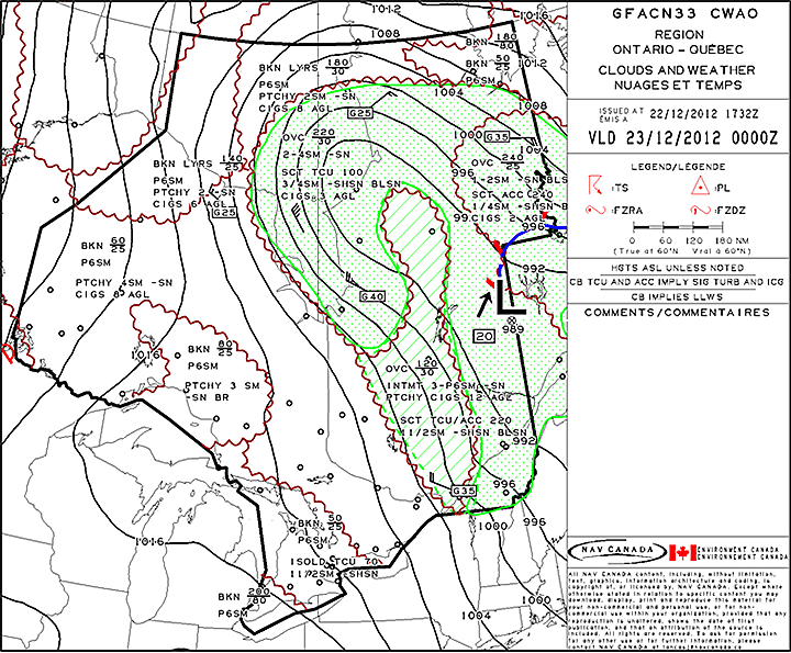 À son arrivée à l’aéroport, vers 13 h 30 temps universel coordonné (UTC)Note de bas de page 5, le commandant de bord a vérifié les conditions météorologiques sur le site Web de NAV CANADA et a déposé un plan de vol auprès du centre d’information de vol (FIC) de Winnipeg. L’heure de départ de ce vol IFR de 3 heures était initialement prévue à 15 h 30 UTC. L’aérodrome de dégagementNote de bas de page 6 prévu était à Moosonee (CYMO) (Ontario). Perimeter n’exploite pas de vol régulier vers CYSK. Plusieurs vols nolisés et d’évacuation sanitaire vers des destinations au Nunavut étaient prévus ce jour-là, et le bureau d’établissement des plans de vol et de suivi des vols a manqué de cartes d’approche aux instruments pour le Nunavut. Il a donc été convenu que l’équipage se procurerait un ensemble de cartes aux bureaux de Keewatin Air avant le départ.