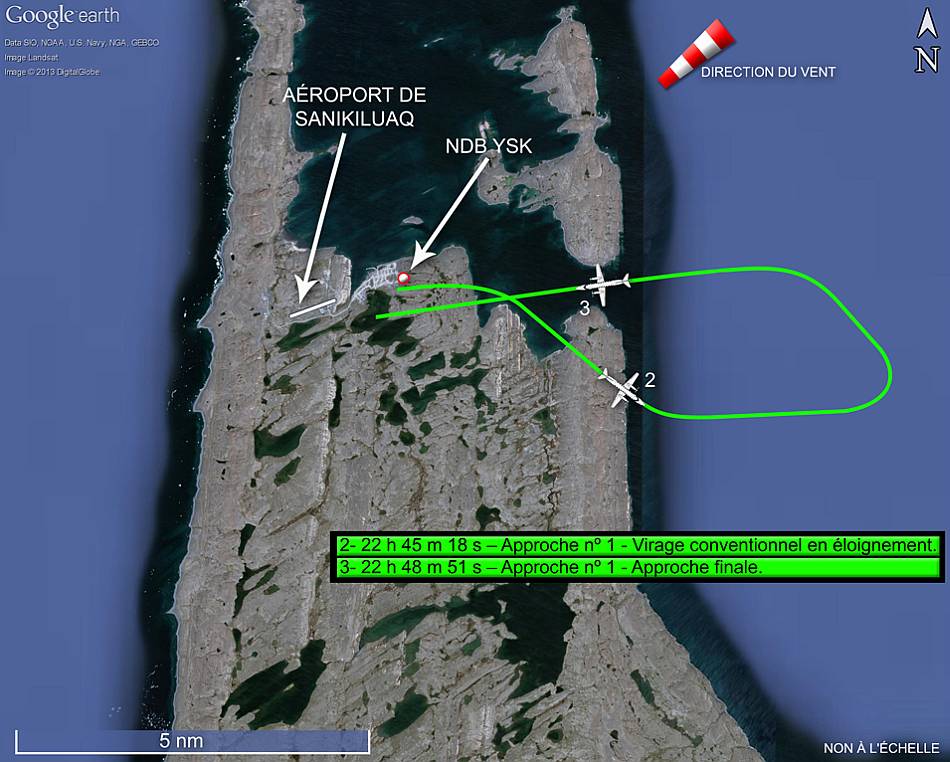 Les environs de la piste pour un atterrissage direct sur la piste 09 n’étaient pas visibles en rapprochement du NDB YSK à une altitude de 1600 pieds asl. Après avoir survolé le NDB YSK à 22 h 44 UTC, l’aéronef a fait route en éloignement pour effectuer la manœuvre complète de virage conventionnel vers l’approche NDB de la piste 27 (figure 2). D’après les cartes publiées, le virage conventionnel doit avoir lieu au nord de l’axe d’approche à 1400 pieds asl.