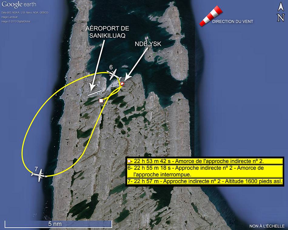 Lorsque l’aéronef s’est trouvé par le travers et au sud de la piste, l’équipage a de nouveau aperçu la piste, mais n’était pas en position pour atterrir sur la piste 09. Au début, l’équipage a amorcé une deuxième manœuvre d’approche indirecte de la piste 09 (annexe B). Durant le virage vers la gauche, l’équipage a de nouveau perdu le contact visuel avec la piste. À 22 h 55 UTC, l’équipage a amorcé une approche interrompue au nord de la piste. Toutefois, il n’a pas suivi la procédure d’approche interrompue publiée (annexe A)Note de bas de page 19. À 2 reprises à intervalle très rapproché durant cette manœuvre, le P/O a annoncé au commandant de bord que la MSA était de 1600 pieds. Le commandant a répondu 1500 pieds, et aucune correction n’a été faite; le P/O n’a pas corrigé cette erreur. L’aéronef a continué son approche indirecte en virage à gauche et sa montée vers le NDB (figure 4).