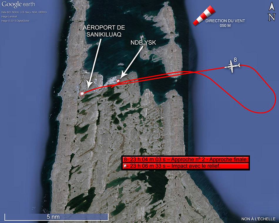 À 22 h 53 UTC, durant l’approche indirecte dans des conditions IMC, l’aéronef est descendu à une altitude indiquée de 400 pieds, à une vitesse de 140 nœuds. Le vent poussait l’aéronef vers le sud de l’axe de la piste 09 dans une zone au sud-ouest de celle-ci où l’élévation du relief est de 223 pieds asl, soit une hauteur de 155 pieds au dessus du sol (agl) lorsque l’on applique la correction en raison du temps froid (figure 3)Note de bas de page 18.