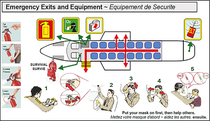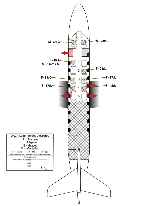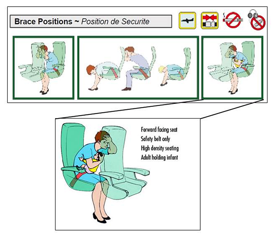Le P/O a donné l’exposé aux passagers montrant la façon de boucler les ceintures de sécurité et l’emplacement des issues de secours. Malgré le fait que la réglementation l’exige, aucun exposé sur la sécurité n’a été donné individuellement à une mère qui voyageait avec son bébéNote de bas de page 8; elle occupait le premier siège à gauche, numéro 1G, voisin de la porte principale. Les sièges n’étaient pas assignés; les passagers pouvaient choisir leur propre siège. On n’a pas demandé à la mère de l’enfant de changer de place.