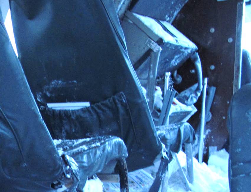 Le revêtement de la partie inférieure du fuselage et la surface inférieure des moteurs ont été entaillés et déchirés durant la glissade sur le sol coupant et rocailleux, ce qui a exposé des faisceaux de fils, des conduites, de l’isolant et des circuits, et déformé le plancher. Le fuselage s’est fracturé à la cloison de pressurisation avant et près de la soute arrière, sous l’arête dorsale. De la neige et du gravier ont envahi le plancher du poste de pilotage par des fentes dans le plancher et le fuselage. Les 2 ailes sont demeurées attachées au fuselage, mais ont été lourdement endommagées. Il n’y a pas eu d’incendie après impact (photo 1).