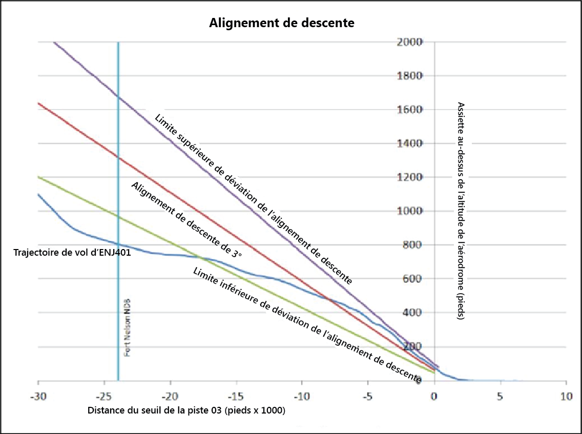 D'après la définition d'approche stabilisée que donne Enerjet, le vol ENJ401 n'était pas stabilisé au cours de l'approche finale, car l'alignement de descente n'était pas de 3°. L'équipage de conduite a reconnu cette situation après que le système d'avertissement de proximité du sol amélioré (EGPWS) a émis à 2 reprises une alerte sonore d'alignement de descente. L'équipage a décidé de poursuivre, car la vitesse de l'aéronef était stable, la trajectoire verticale se rapprochait de l'alignement de descente et les volets se positionnaient en configuration d'atterrissage. L'équipage de conduite a jugé que l'approche était récupérable.
