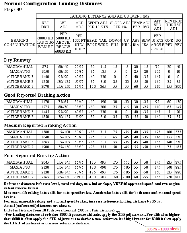Une autre méthode pour déterminer la distance d'atterrissage est d'utiliser la distance établie pour une piste sèche du manuel de Boeing, qui indique les distances réelles, puis le Tableau 1, « Coefficient canadien de frottement sur piste (CRFI), Distances d'atterrissage recommandées (sans effet de disque/inversion de poussée) », du Supplément de vol - Canada. Le calcul donne une distance d'atterrissage sur piste sèche de 3035 pieds ce qui, avec un CRFI de 0,45, donnerait une distance de 5650 pieds. En ajoutant les 800 pieds de piste pour l'arrondi, la distance requise serait de 6450 pieds.