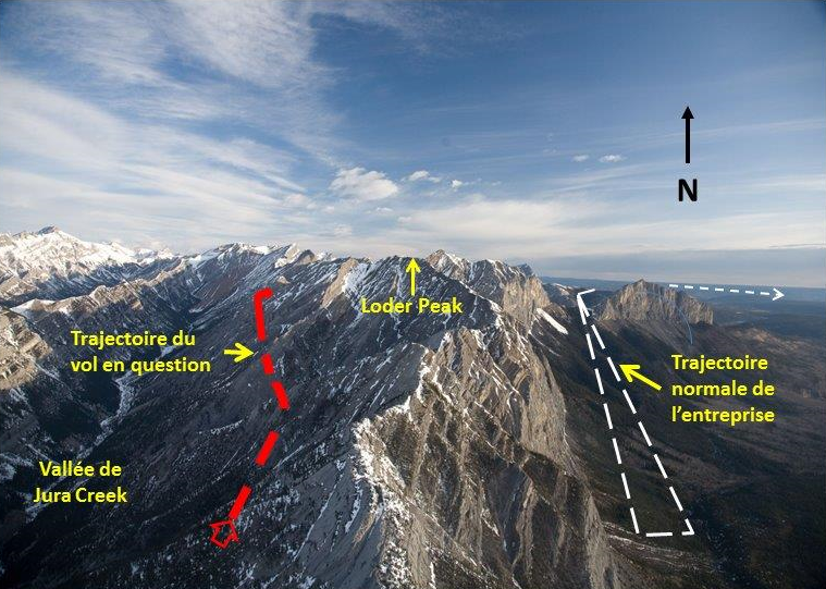 L'itinéraire de vol du Rockies Heritage Tour était un parcours circulaire de 25 à 27 milles marins (nm). En temps normal, ce vol se dirigeait vers le sud de la base CNK7 jusqu'à Barrier Lake, puis vers l'ouest jusqu'à Heart Mountain et vers le nord jusqu'à la route Transcanadienne. Après avoir traversé la route Transcanadienne, le vol devait normalement poursuivre une trajectoire vers le nord et à l'est de Loder Peak (photo 1). Un vol suivant une trajectoire à l'ouest de Loder Peak entrerait dans la vallée de Jura Creek et traverserait ensuite une crête au nord de Loder Peak d'ouest en est, avant de descendre jusqu'à Brokenleg Lake. Les crêtes au nord de Loder Peak atteignent de 7300 à 7400 pieds au-dessus du niveau la mer (asl). La trajectoire à l'est de Loder Peak était parallèle aux flancs de montagne à l'est et au nord de Loder Peak, la plaine de l'Alberta se trouvant immédiatement à l'est. La trajectoire du côté est pouvait être suivie à une altitude considérablement moins élevée. Une fois arrivé à Brokenleg Lake, avec ou sans arrêt, le vol devait retourner directement à la base CNK7. Le pilote pouvait, à sa discrétion, modifier sa trajectoire selon le vent, les conditions météorologiques ou le manque de temps. La durée du vol ayant mené à l'accident devait être de 0,3 heure dans les airs pour un total d'environ 1,3 heure, les passagers ayant choisi de faire l'arrêt à Brokenleg Lake.