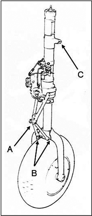 La rupture initiale du train d'atterrissage avant est survenue lorsque le bras inférieur du compas s'est fracturé sous le point d'attache au bras supérieur du compas (figure 1, A). Des ruptures supplémentaires sont indiquées aux points B et C dans la figure 1.