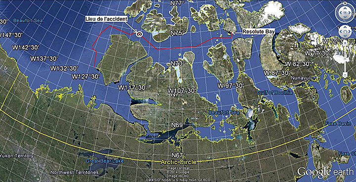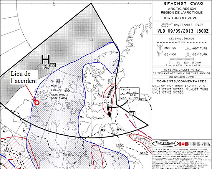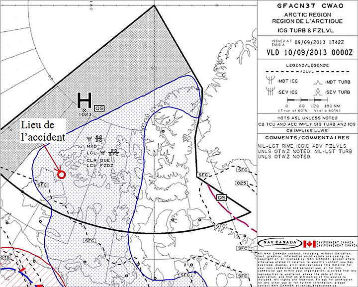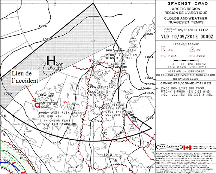 Il n'y a qu'un nombre limité de messages d'observation météorologique régulière pour l'aviation (METAR) pour l'archipel arctique canadien qui comprennent les rapports d'état du ciel (hauteur du plafond nuageux et nébulosité), de visibilité et de temps actuel. Au moment de l'accident, l'endroit le plus proche qui diffuse des METAR était Sachs Harbour (CYSY) (Territoires du Nord-Ouest), sur la côte sud-ouest de l'île Banks, à environ 200 nm. Selon le METAR de 17 h, le vent soufflait de l'est à 11 nœuds, la visibilité était de 15 milles terrestres (sm) avec des nuages fragmentés à 1700 pieds au-dessus du niveau du sol (agl) et une autre couche de nuages fragmentés à 25 000 pieds agl, la température était de 2 °C et le point de rosée était de +1 °C. Plusieurs autres observations météorologiques sont disponibles pour la région autour du détroit de M'Clure; toutefois, aucune d'entre elles ne comprend l'état du ciel, la visibilité et le temps actuel.