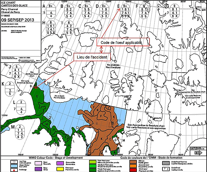 Le lendemain, le 9 septembre 2013, à 16 h 38, heure avancée des RocheusesNote de bas de page 4, le vol CCG364 a décollé du pont du NGCC Amundsen avec le pilote, le capitaine du navire et un scientifique à bord. Le scientifique, qui occupait le siège passager de gauche, transportait de l'équipementNote de bas de page 5 pour mesurer l'épaisseur de la glace. Le capitaine, qui était assis derrière le scientifique, était à bord pour effectuer une mission de reconnaissance afin de déterminer la meilleure route possible du NGCC Amundsen pour se rendre à la prochaine station scientifique, à l'ouest de l'île Banks. Des vents du nord avaient poussé la glace dans le secteur sud du détroit de M'Clure, ce qui avait entraîné la formation d'une banquise serrée à très serrée de vieille glaceNote de bas de page 6 le long de la partie ouest de la côte nord de l'île Banks. Un spécialiste du service des glacesNote de bas de page 7 se trouve normalement à bord des navires de la Garde côtière canadienne (GCC) affectés à la plupart des opérations dans l'Arctique, y compris les missions scientifiques. Cependant, il n'y avait pas de spécialiste du service des glaces pour la mission en cause.