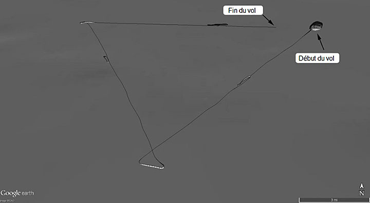 Les données montrent que juste avant l'accident, à 17 h 39 min 19 s, l'hélicoptère volait à l'horizontale à 36 pieds en direction est et maintenait une altitude variant de 23 à 39 piedsNote de bas de page 23 jusqu'à 17 h 42 min 49 s. La vitesse sol moyenne durant cette période était de 67 nœuds. L'hélicoptère a alors descendu lentement jusqu'à ce qu'il entre en collision avec la surface de l'eau. Les données indiquent une vitesse sol de 68 nœuds et une altitude de 3 pieds à 17 h 43 min 2 s, heure du dernier enregistrement de données. La descente durant les 13 dernières secondes du vol correspond à un taux de 166 pieds par minute.