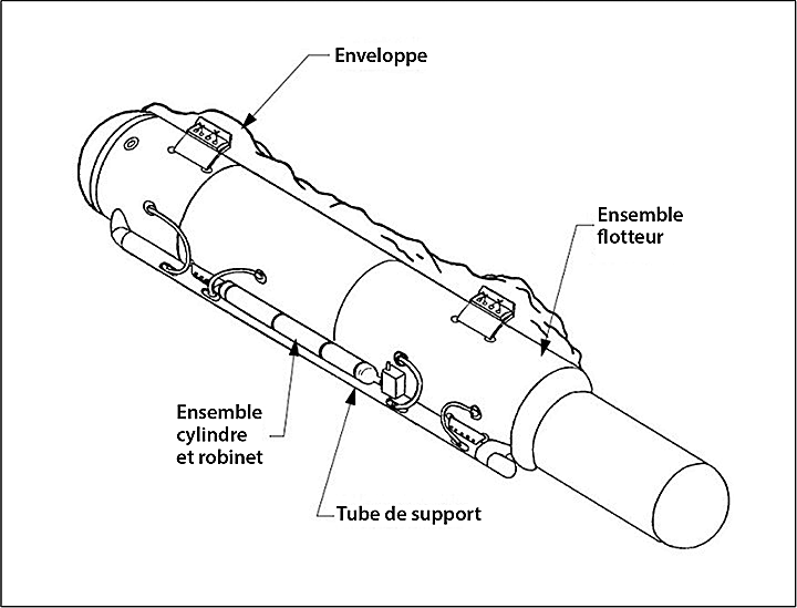 L'hélicoptère était muni d'un dispositif de flottaisonNote de bas de page 24 conçu pour permettre un amerrissage d'urgence et maintenir l'hélicoptère à flot. Ce dispositif permet de déployer les flotteurs durant le vol à une altitude de 3000 pieds ou moins et à une vitesse indiquée de 80 nœuds ou moins. Une fois ces flotteurs déployés, la vitesse indiquée maximale est de 100 nœuds. Le dispositif de flottaison consiste en 2 sous-systèmes de flotteurs fixés aux patins de gauche et de droite de l'hélicoptère (figure 4).
