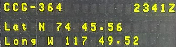 À 18 h 5, soit 27 minutes après la dernière transmission par le CCG364, on a vérifié la position de l'hélicoptère sur le panneau de commande et d'affichage (CDU) du système de suivi des vols (SSV), situé dans la timonerie. Le CDU indiquait que l'hélicoptère se trouvait à une distance de 3,2 nm, à un relèvement de 287° vrai (V) par rapport au navire. La dernière et seule position qu'avait l'équipage dans la timonerie était celle indiquée sur le CDU du SSV, soit N 74° 45.56, W 117° 49.52Note de bas de page 13 à 17 h 41. On a essayé à plusieurs reprisesNote de bas de page 14 d'établir la communication avec le CCG364, mais sans succès.