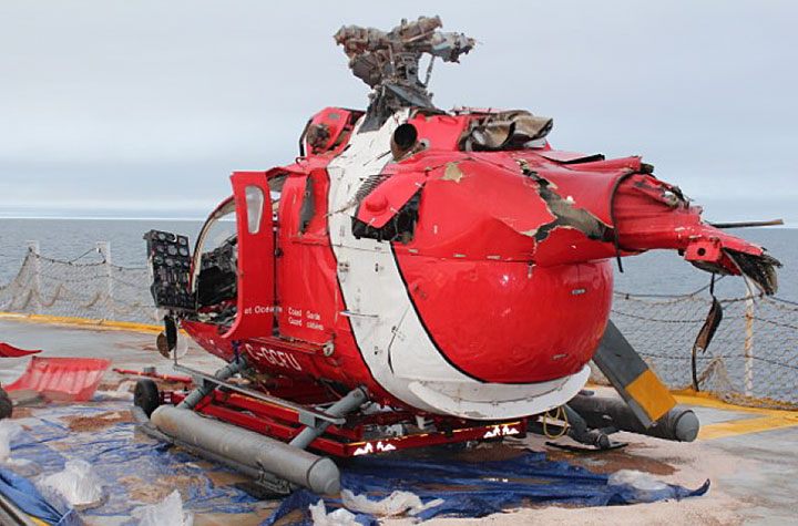 L'hélicoptère a été lourdement endommagé par l'impact avec la surface de l'eau. On a noté des dommages considérables à la partie supérieure du pare-brise et du tableau de bord. La poutre de queue était arrachée près de l'avant de celle-ci, et 3 pales du rotor principal avaient été arrachées à leur racine (photo 1).