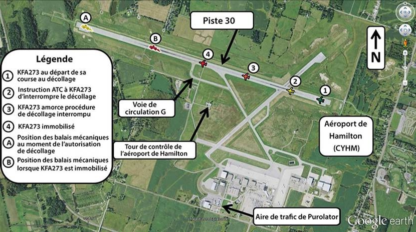 Un Boeing 727-281 (immatriculé C-GKFJ, numéro de série 21455), assurant le vol KFA273 pour le compte de Kelowna Flightcraft Air Charter Ltd., décolle de la piste 30 à l'aéroport de Hamilton (Ontario) à 2 h 8, heure avancée de l'Est, durant les heures d'obscurité, à destination de l'aéroport international James Armstrong Richardson à Winnipeg, au Manitoba. Deux balais mécaniques travaillent près de l'extrémité départ de la piste 30. Durant la course au décollage, le contrôle de la circulation aérienne transmet l'instruction à l'avion d'interrompre le décollage, et l'équipage de conduite obtempère. L'avion s'immobilise approximativement au milieu de la piste de 10 006 pieds de long, à environ 1200 pieds des véhicules. Il n'y a ni dommages ni blessés.