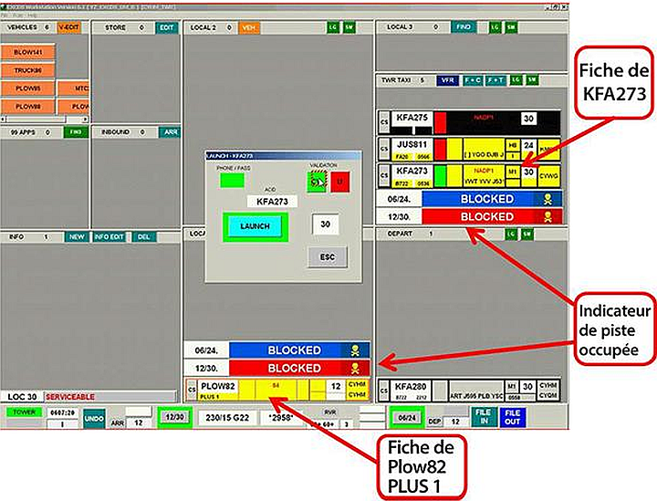 Le contrôleur utilise un système d'affichage amélioré (EXCDS) (figure 1). Il s'agit d'un système informatisé de coordination des données qui permet aux contrôleurs de gérer les données de vol en format électronique sur des écrans d'affichage plutôt qu'en fiches de progression de vol en papier. Ce système comprend un rappel visuel appelé indicateur de piste occupée; le contrôleur a activé cette fonction pour indiquer que la piste était occupée.