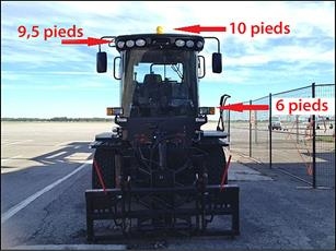 Comme le prescrit la publication de Transports Canada intitulée Aérodromes – Normes et pratiques recommandées, les balais mécaniques doivent être munis d'une balise lumineuse. Ces véhicules ont une balise installée sur le toit de leur cabine, à 10 pieds au-dessus du sol. En outre, ils sont munis de 6 projecteurs blancs situés à 9,5 pieds au-dessus du sol, et de 2 phares à 6 pieds au-dessus du sol (figure 2).