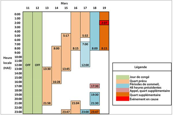 La tour de contrôle CYHM est fonctionnelle 24 heures sur 24. Durant la semaine qui a précédé le quart de travail en cause, le contrôleur avait travaillé 5 quarts réguliers dont les heures de début variaient de tôt le matin à tard la nuit (figure 3). Le 18 mars 2013, premier jour de congé prévu du contrôleur, il y a eu un quart supplémentaire imprévu, et l'on a appelé le contrôleur à 17 h 30 pour lui offrir la possibilité de travailler. Le contrôleur a d'abord refusé; cependant, il a reçu un deuxième appel où on lui a dit que personne d'autre ne s'était porté volontaire; il a alors accepté. Le quart supplémentaire a commencé à 23 h 47. Afin d'être reposé, le contrôleur a dormi pendant 2 heures avant le début du quart.