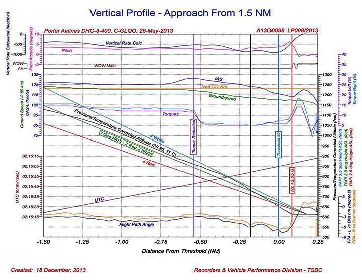 Les données de l'enregistreur de données de vol (FDR) démontrent que, quelques secondes avant de franchir 500 pieds HAT, l'appareil avait dérivé légèrement sous l'alignement de descente et qu'une correction avait été appliquée pour le ramener sur l'alignement. Pendant que l'approche se poursuivait, l'avion a continué à dériver au-dessus de l'alignement de descente. Le pilote aux commandes a tenté de corriger au moyen d'un léger piqué et d'une faible réduction de poussée. Lorsque l'appareil est passé sous 300 pieds HAT, la vitesse indiquée avait augmenté à 131 nœuds; elle était donc toujours dans une marge de VREF +10. Cependant, l'avion a continué de dériver au-dessus de l'alignement de descente idéal de 3° signalée par l'indicateur de trajectoire d'approche de précision (PAPI). Quelques secondes plus tard, lorsque l'appareil est descendu sous 250 pieds HAT, le pilote aux commandes a réduit la poussée du moteur de 13 % à environ 5 % (ralenti de vol) et piqué légèrement. Cette réduction de puissance aurait réduit considérablement le débit d'air au-dessus des ailes et la portance. De plus, la traînée de profil des hélices, qui auraient été au petit pas pendant le ralenti de vol, aurait ralenti l'aéronef. La vitesse indiquée a commencé à baisser immédiatement. Toutefois, l'avion a continué à dériver au-dessus de l'alignement de descente et, à 0,4 milles marins et 200 pieds HAT, il a atteint l'alignement de descente PAPI de 3,5°; à partir de ce point, la vitesse verticale de descente a commencé à augmenter.