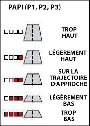 Les indicateurs de pente d'approche ou indicateurs visuels de pente d'approche comprennent différents types de systèmes, dont les PAPI. Un PAPI est composé de 4 feux disposés en barre de flanc du côté gauche de la piste. Lorsque les 2 feux les plus proches du bord de la piste semblent rouges et les deux autres, blancs, cela signifie que l'avion suit la pente d'approche nominale de 3°. Lorsque la pente d'approche est de 3,5° ou plus, les 4 feux apparaissent blancs (trop haut), tandis que si la pente d'approche est de 2,5° ou moins, les 4 feux apparaissent rouges (trop bas) (figure 2).