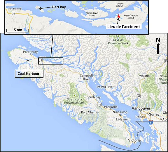 CBE Construction Ltd. mène ses activités sous le nom commercial Air Cab à partir de l'hydrobase de Coal Harbour (Colombie-Britannique), à environ 19 milles marins (nm) à l'ouest de Port McNeill (Colombie-Britannique). Le matin du 24 octobre 2013, on a fait le plein de carburant de C-FQGZ (l'aéronef) [les réservoirs ayant une capacité de 76 gallons américains, ou 460 livres], et le pilote a effectué l'inspection prévol de l'aéronef. À 10 h 46Note de bas de page 1, après avoir discuté du plan de vol avec le propriétaire de l'entreprise, le pilote a quitté Coal Harbour pour effectuer un vol selon un itinéraire de vol d'entreprise à destination de l'hydrobase de Port McNeill (annexe A). À Port McNeill, 2 passagers ont reçu un exposé sur les mesures de sécurité et des vêtements de flottaison individuels (VFI) avant de prendre place à bord de l'aéronef. Tous les occupants portaient leur VFI durant le vol.