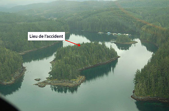 L'aéronef s'est immobilisé, presque à l'envers, sur un relief densément boisé, à une altitude de 27 pieds asl sur la plus grosse de 2 îles situées à l'embouchure de Potts Lagoon (photo 1). Les arbres aux alentours du lieu de l'accident étaient d'une hauteur approximative de 75 à 80 pieds au-dessus du niveau du sol (agl). Les marques d'impact sur ces arbres révèlent que la trajectoire finale de l'aéronef suivait une route magnétique d'environ 350°, que son angle de descente était initialement de quelque 70° sous l'horizontale, et que l'angle s'est accentué à la verticale après que l'aéronef a heurté un bosquet de gros arbres (photo 2).