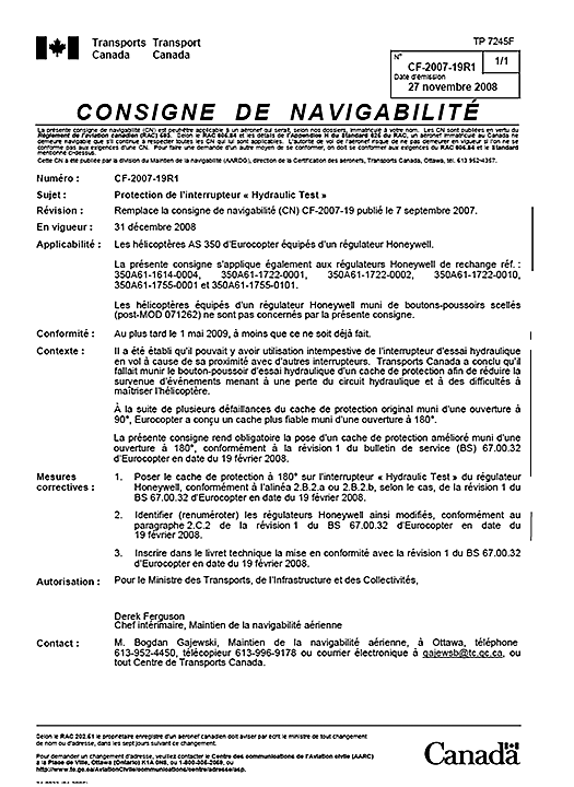Source : Transports Canada, Consigne de navigabilité no CF-2007-19R1 (27 novembre 2008)