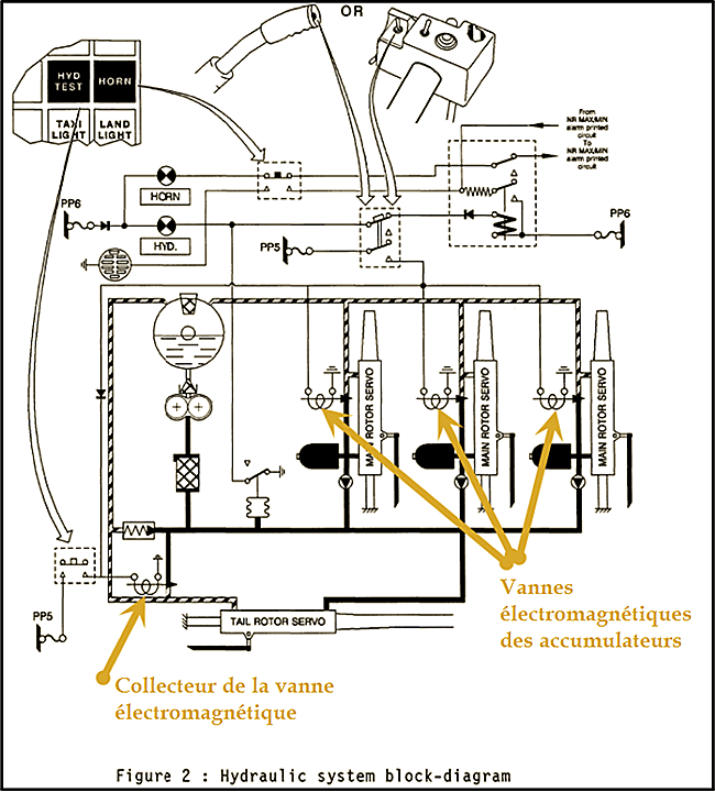 L’activation de l’interrupteur HYD TEST ouvre le collecteur de la vanne électromagnétique (Manifold Solenoid Valve) et dépressurise le circuit hydraulique.