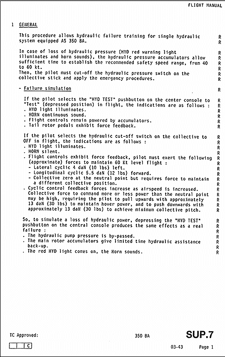 Le risque d'une rétroaction importante dans les commandes de vol lors d'une défaillance du circuit hydraulique est mentionné aux sections 3 et 7 du RFM, et dans les suppléments du RFM :
