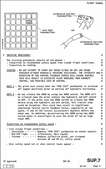 Le pilote instructeur a suivi une procédure similaire à celle décrite dans le supplément 7 du RFM, SUP.7, Hydraulic Pressure Failure Training Procedures in Cruise Flight Conditions [Procédure à suivre pendant la formation sur la perte de pression hydraulique en vol de croisière], au début du premier exercice de panne hydraulique. Il a placé l’interrupteur HYD TEST à la position TEST; le klaxon a retenti, le voyant HYD s’est illuminé et les servocommandes sont restées pressurisées. Puis, le pilote instructeur a attendu que le pilote en formation atteigne la plage de vitesse de sécurité avant de replacer l’interrupteur HYD TEST à OFF; le voyant HYD s’est éteint et le klaxon a cessé de retentir. On peut donc conclure que lors de cette étape du vol d’entraînement, le circuit hydraulique a fonctionné comme prévu et que l’exercice s’est déroulé en conformité avec les directives du SUP.7.