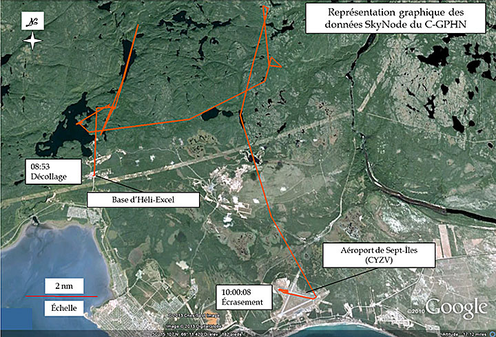 À 8 h 53Note de bas de page 1, le C-GPHN a décollé de la base de Héli-Excel inc. (Héli-Excel) à Sept-Îles (Québec) pour effectuer un vol d'entraînement. Le pilote instructeur occupait le siège de gauche, un des pilotes en formation occupait le siège de droite et l'autre pilote était assis dans le siège 1B, situé derrière le pilote instructeur, en tant qu'observateur. Les 50 premières minutes du vol se sont déroulées au nord de l'aéroport de Sept-Îles (CYZV) où divers types d'atterrissage sur des aires non aménagées ont été effectués (figure 1). Vers 9 h 37, l'appareil s'est dirigé vers l'aéroport de Sept-Îles pour effectuer des exercices de panne moteur en stationnaire et de panne du circuit hydraulique.