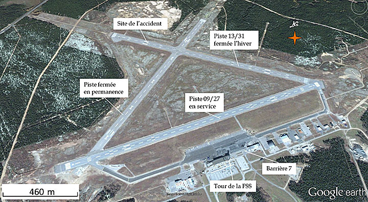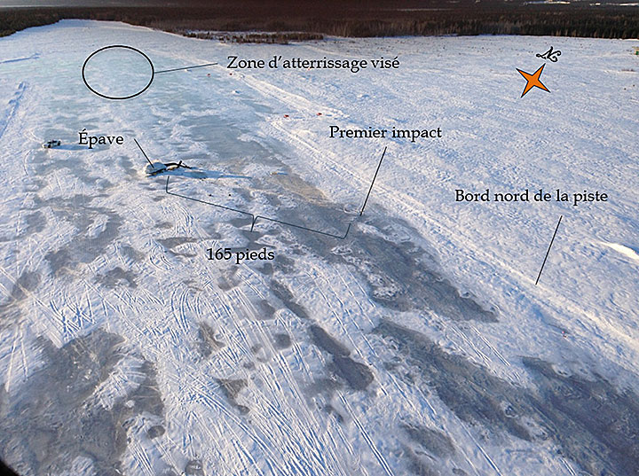 L'appareil a heurté le sol avec un angle en piqué d'environ 45° et un angle d'inclinaison latéral d'environ 100° sur la gauche. Le premier point d'impact était près du bord nord de la piste 13/31 (figure 2). Les pales du rotor principal ont percuté la piste en premier, suivies par le nez de l'hélicoptère. L'appareil a glissé sur le côté gauche vers le centre de la piste sur approximativement 165 pieds avant de s'immobiliser sur la piste 13/31 à quelque 1000 pieds du seuil de la piste 13.