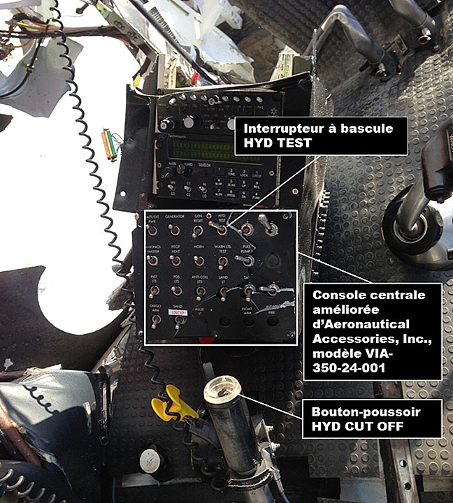 L'interrupteur HYD TEST est situé à côté d'autres interrupteurs de forme similaire (figure 4). Il a été déterminé que l'activation inopinée de l'interrupteur HYD TEST peut survenir en vol en raison de la proximité des autres interrupteurs. Afin d'éviter l'activation accidentelle de cet interrupteur, Eurocopter a publié, en novembre 2005, le bulletin de service BS 67.00.32 qui recommandait l'installation d'une coquille ou d'un couvercle escamotable (cache de protection) par-dessus le bouton-poussoir HYD TEST des consoles centrales Honeywell.