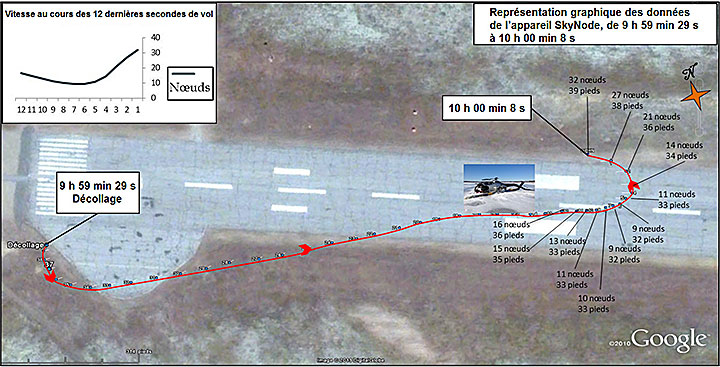 Les traces d’impact et les données de l’appareil SkyNode indiquent que la perte de maîtrise est survenue alors que l’hélicoptère évoluait légèrement au nord de la piste à une hauteur d’environ 35 pieds au-dessus du sol (agl) et à une vitesse sol de 32 nœuds (figure 8). Étant donné que l’appareil n’était pas dans l’axe de piste, on peut penser que le pilote instructeur exerçait une pression supplémentaire vers la gauche sur le manche cyclique afin de rejoindre l’aire d’atterrissage en bout de piste.