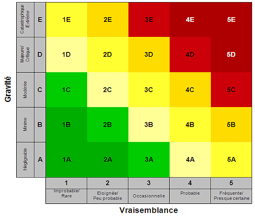 | Au moment de procéder à une Analyse des risques, le Niveau de risque repose sur une évaluation des deux facteurs suivants : Vraisemblance qu'un scénario de risque se produise et Gravité des événements. Le Niveau de risque est une combinaison de deux variables (un chiffre et une lettre) résultant de l'intersection entre la VRAISEMBLANCE et la GRAVITÉ dans la matrice présentée au tableau 1 ci-dessous. |