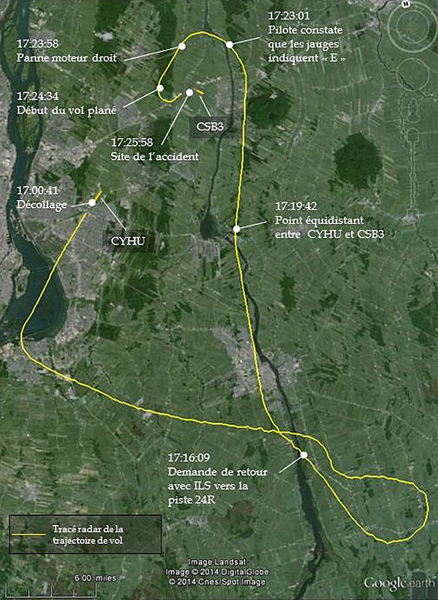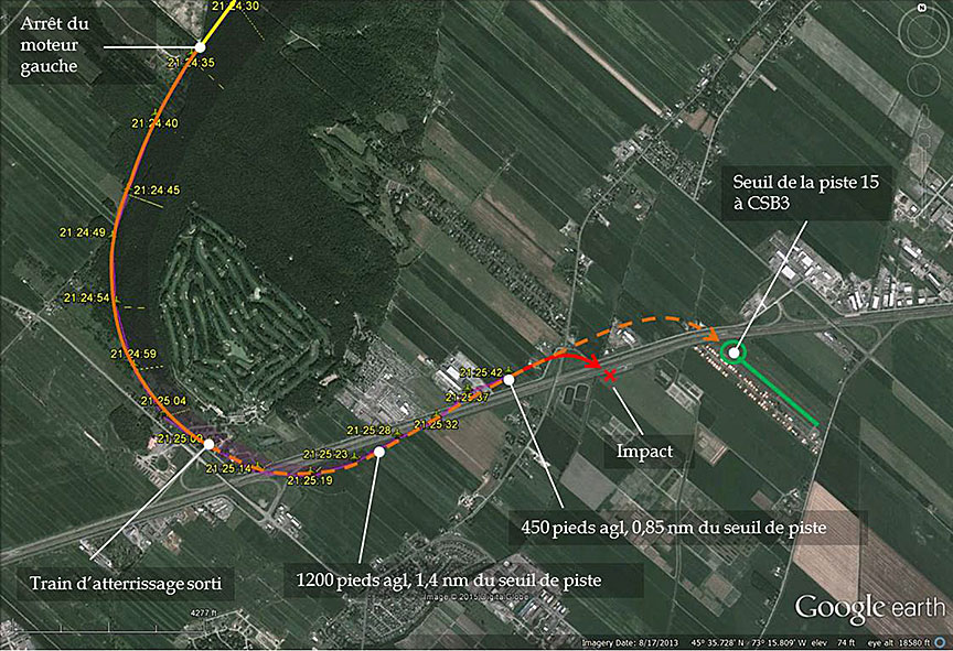 À 17 h 24 min 34 s, alors que le C-GJSU était à 2400 pieds asl, à 7,4 nm de la piste, et toujours sur une trajectoire en direction de CYHU, le moteur gauche s'est arrêté. Le pilote a amorcé un virage à gauche vers la nouvelle destination. Au cours des 40 secondes suivantes, la vitesse sol du C-GJSU est passée de 180 nœuds à 110 nœuds.