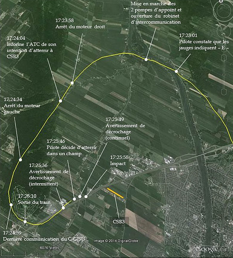 À 17 h 25 min 42 s, alors que l'appareil se trouvait à environ 450 pieds au-dessus du sol (agl) et à 0,85 nm du seuil de la piste 15, le pilote a décidé d'atterrir dans un champ situé à droite. À compter de 17 h 25 min 49 s, le klaxon de l'avertisseur de décrochage a retenti de façon continue jusqu'à ce que l'appareil percute le sol.