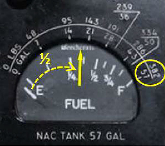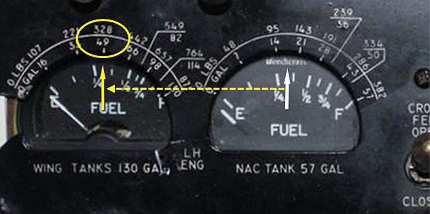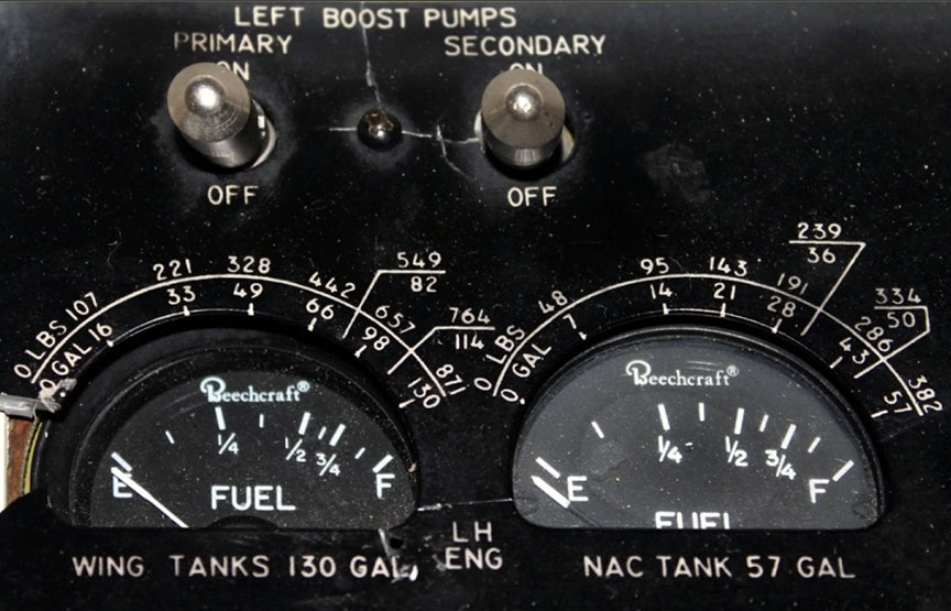 Le circuit de carburant est conçu de manière à alimenter les 2 moteurs indépendamment l'un de l'autre. Chaque moteur est alimenté par 4 réservoirs d'aile totalisant 130 gallons américains utilisables. Le carburant se déverse dans un réservoir de nacelle moteur d'une capacité de 57 gallons américains utilisables, pour un total de 374 gallons américains, (c.-à-d., 2618 livres pour du Jet A-1 à 15° CNote de bas de page 15).