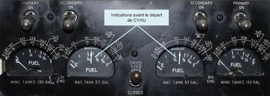 | Moment clé du vol | Heure | Carburant à bord (en minutes et secondes) | Temps de vol pour atteindre CYHU (en minutes et secondes)Note de bas de page * |