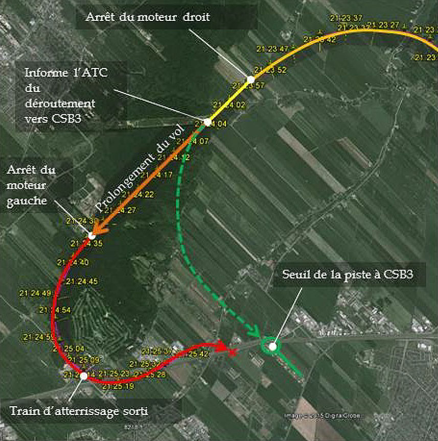 | Arrêt du moteur gauche, début du vol plané | 17:24:34 | 0 | 2 min 33 s |